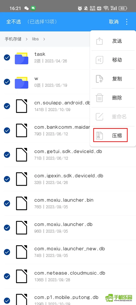 4、然后再次点击右上角,会弹出一个选择框,在其中选择压缩;