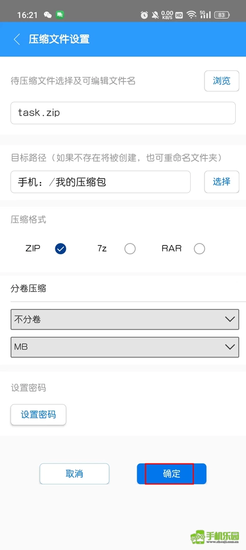 5、最后进入压缩文件设置界面,选择压缩路径、格式,并决定是否设置密码,之后点击确定按钮即可完成操作。