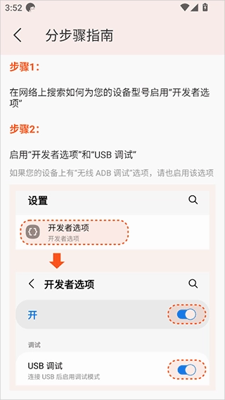 1、开启设备的开发者选项,通常需在设置页面连续点击版本号五到七次,若不清楚具体操作,也可通过网络搜索对应设备型号的开发者选项开启方法。