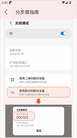 6、接着点击“无线调试”中的“使用配对码对设备进行配对”