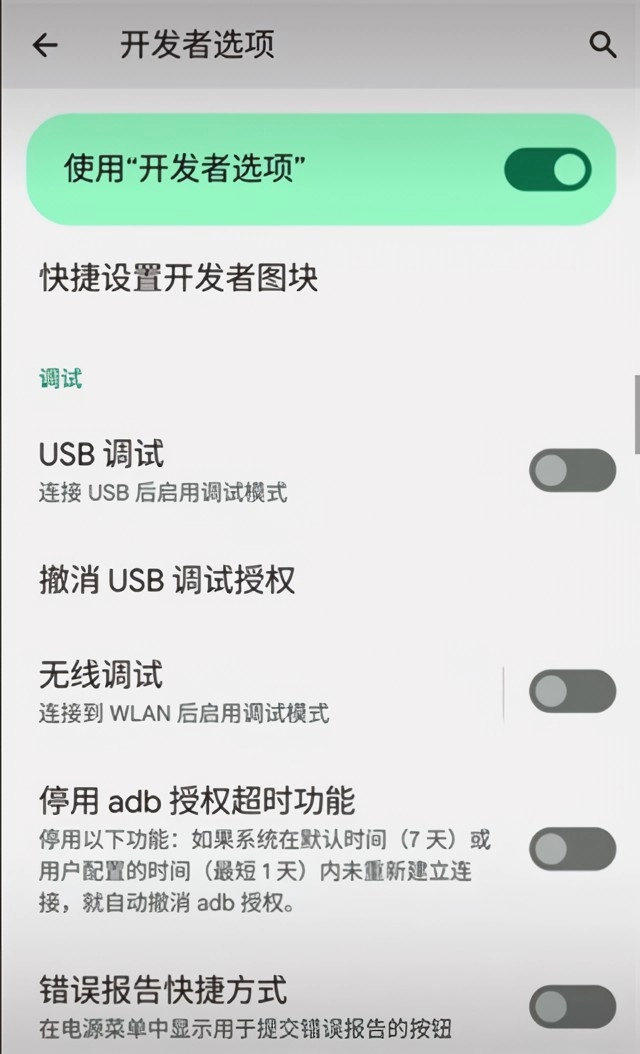 4、打开之后返回开发者选项界面,然后开启无线调试功能。
