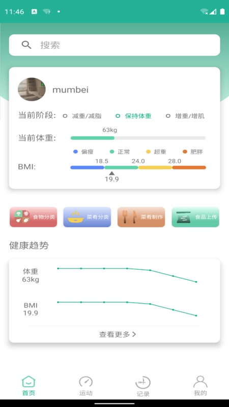 2、健康趋势;此功能可以显示用户的体重和BMI变化趋势,另外,还可以自定义新的项目,满足个性化需求。