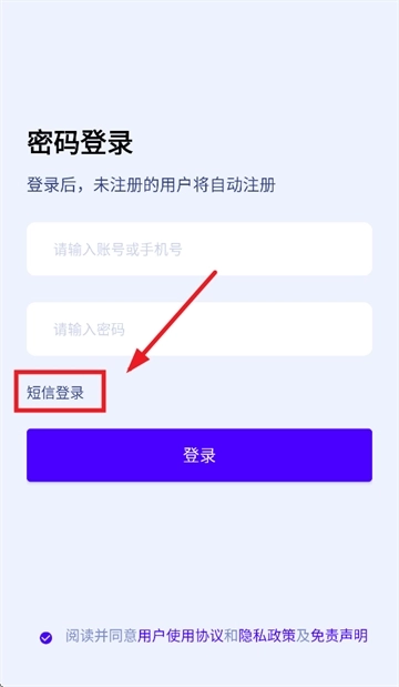 输入手机号,验证码,勾选阅读并同意用户使用协议和隐私政策及免责声明,点击登录即可