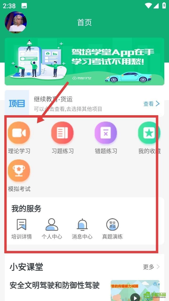 2、首页功能多样,理论学习、习题练习等模块图标清晰醒目,继续教育项目展示直观明了,“我的服务”包含培训详情等实用功能,小安课堂定期推送安全驾驶知识,帮助学员系统高效备考。