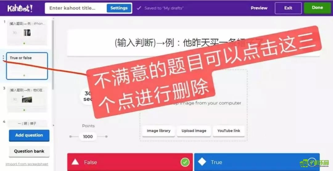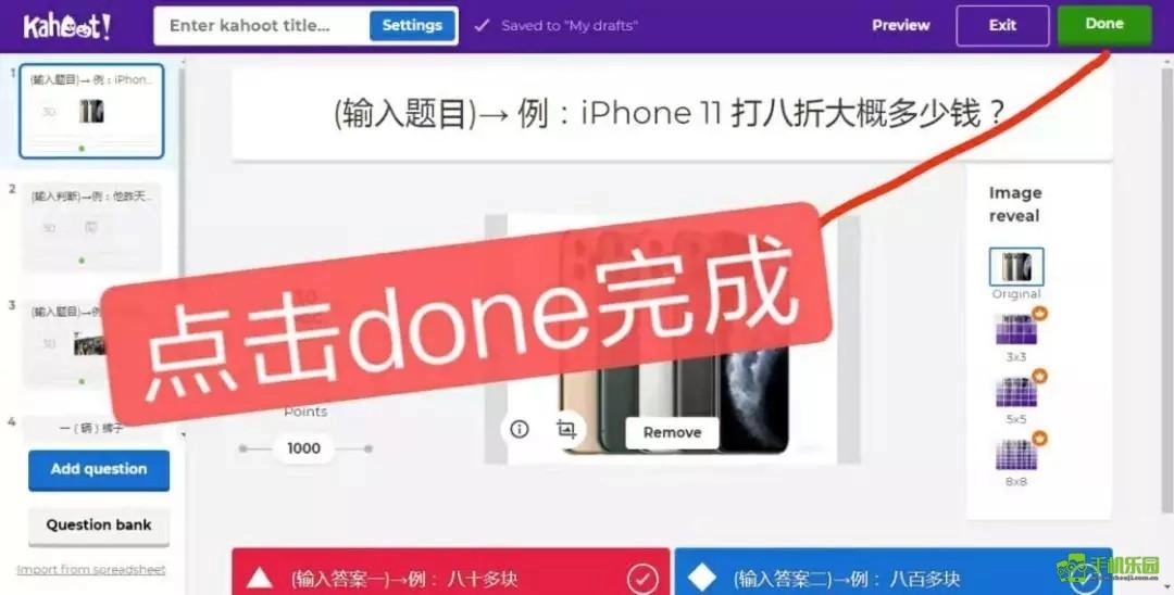 点击右上角的done,完成该kahoot的编辑,如果未完成,平台会提示你继续完善。