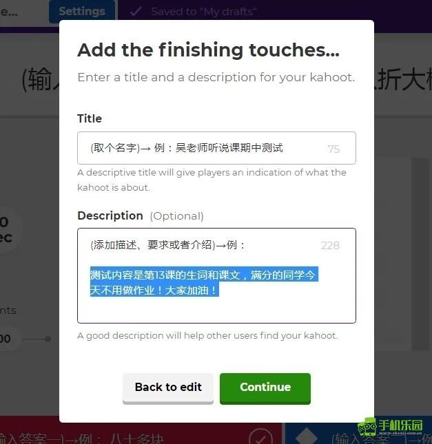给该kahoot在线抢答取一个名称(必要),加上一些描述(非必要),如图所示。