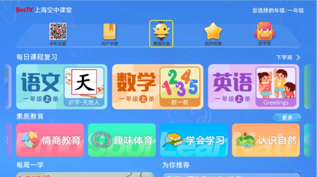 第二步:点击空中课堂图片进入点播专区。首次进入“空中课堂”,选择学生目前所在年级后,进入相应年级首页。