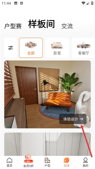 1、打开知户型应用,在【样板间】板块里挑选出你喜欢的设计方案,点击该方案下方的【体验设计】按钮,就能直接进入户型绘制的操作界面了。