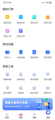 1、打开福棠儿医,在软件“我的”个人信息设置界面中选择点击“就诊卡”功能选项。