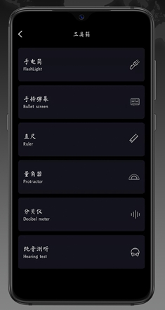 【工具集合】提供了水平仪、分贝仪、量角器、直尺、手持弹幕、手电筒、听力测试等增强工具