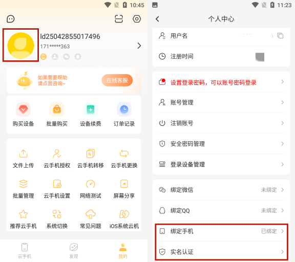 第三种:先点击“我的”,再点击“续费云手机”也可以,下图右边所示