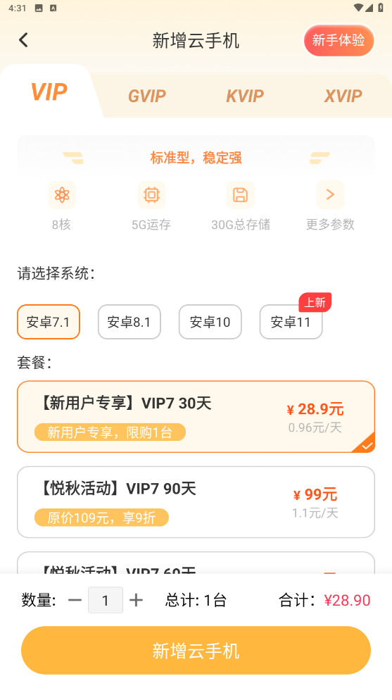 随后会进入“新增云手机”,选择好自己要购买的设备套餐,然后点击底部的“新增云手机”完成付款即可。