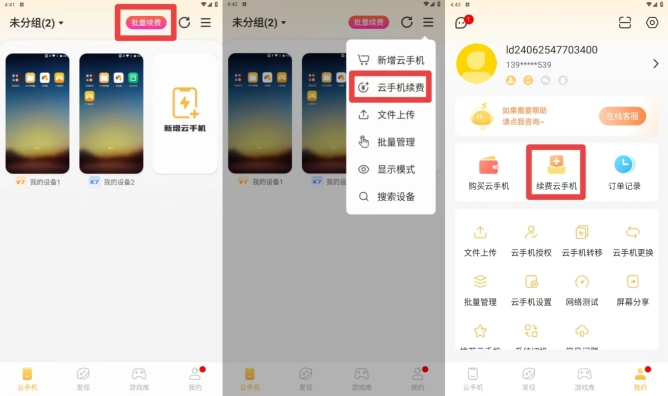 第二种:点击右上角菜单,再点击“云手机续费”也可以,下图中间所示