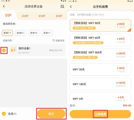 2、随后进入续费界面,选择要续费的设备点确定,然后选择要续费的套餐类型点立即续费,随后进行支付就可以了。