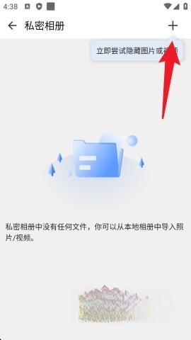 2. 前往“隐私相册”页面,点击右上角的“加号”图标,您可以轻松导入并隐藏本地的照片或视频。