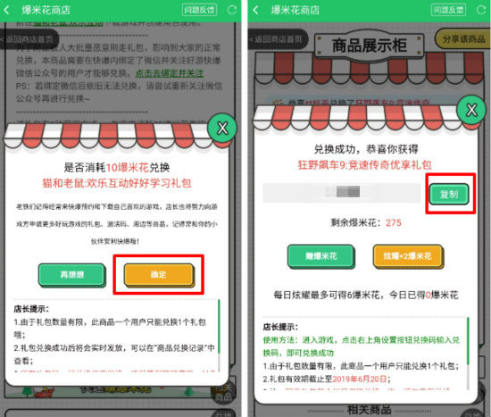 3、分享完成后返回好游快爆,再次点击【兑换】按钮,认真阅读弹窗提示后选择【确定】,即可完成兑换。兑换成功后点击【复制】,就能将获取的礼包码复制下来,前往游戏内进行兑换啦。