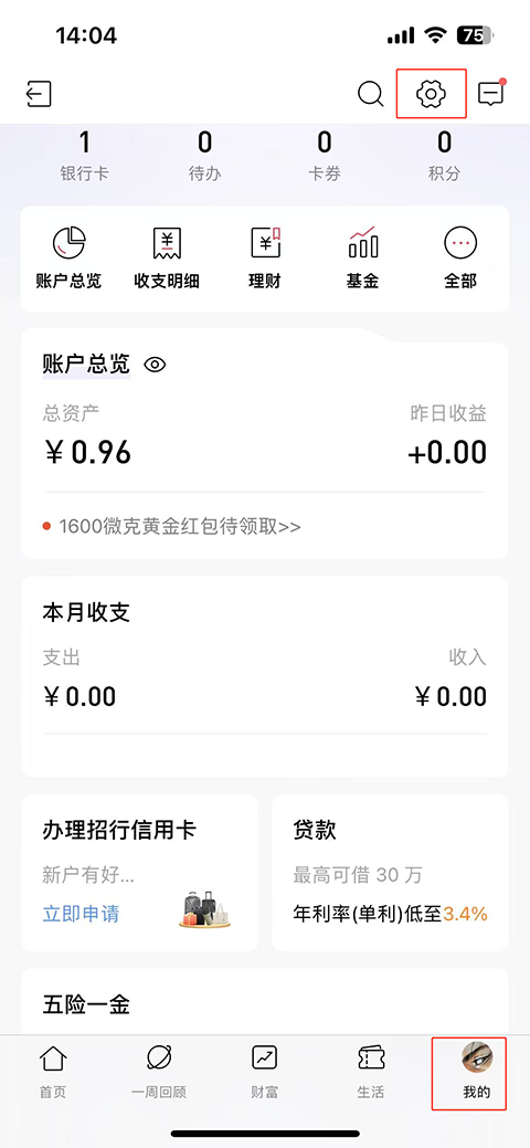 1、打开招商银行,点击右下角的“我的”选项。再点击左上角的个人头像或右上角的设置图标。