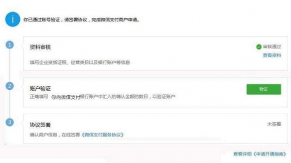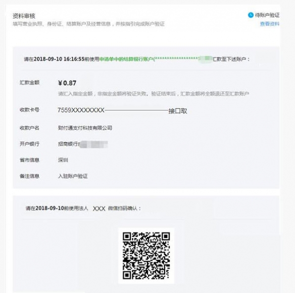 3、微信审核通过后,启动账户验证流程,依据指引步骤,使用主体对应的账户,向财付通支付公司汇入一笔指定金额的款项。