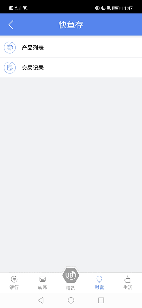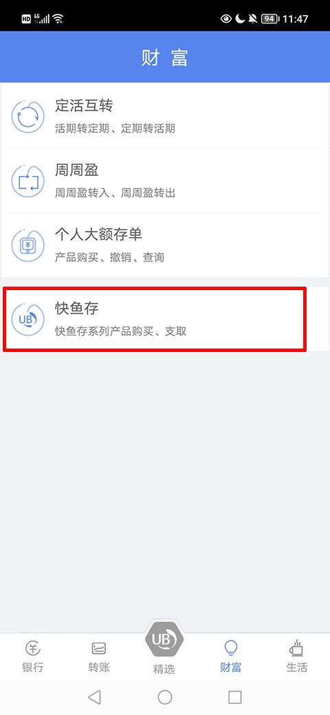 1、第一步,启动软件后,在软件的财富板块里找到“快鱼存”选项并点击它;