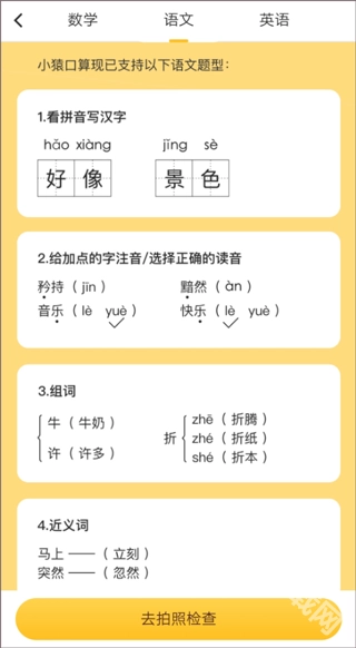 看拼音写汉字;给加点的字注音/选择正确的读音;组词;近义词;反义词;补全词语;默写古诗;作文搜索。