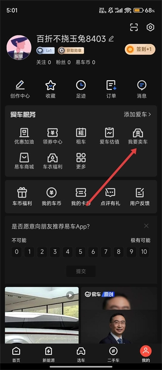 1、打开易车,在【我的】页面点击【我要卖车】,开启卖车流程呢。