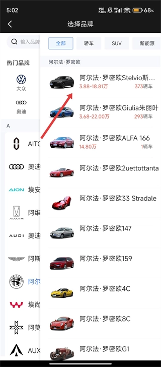 2、进入品牌选择页面后,找到并点击您要出售车辆对应的品牌,例如【阿尔法-罗密欧Stelvio斯坦维】这类具体品牌车型。