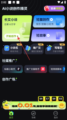 1、在Ai小说创作精灵首页,点击长文小说下的开始创作。
