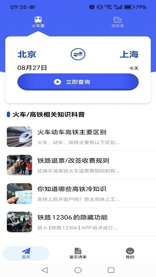 1、火车票查询功能位于首页,点击“立即查询”即可使用,同时首页还呈现了与火车相关的科普内容。