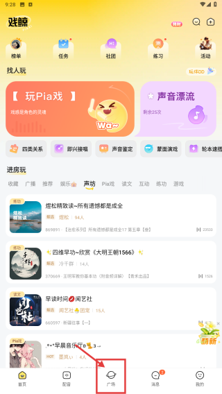 1、打开语音社交应用,点击底部广场选项,进入广场页面。