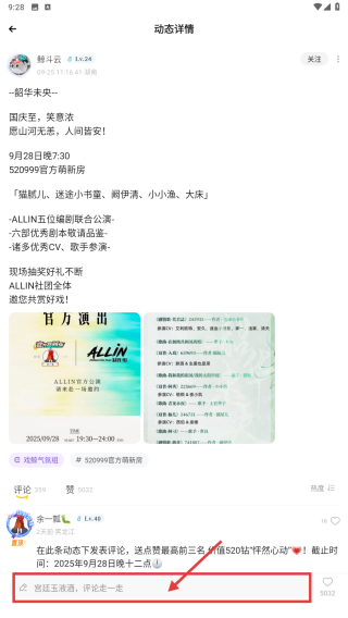 4、在动态详情页,进行赞过且置顶,评论走一走的互动操作,参与动态互动。