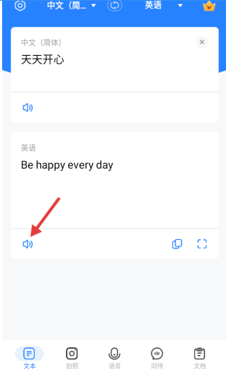 3、翻译完成后,点击语音图标,可收听翻译结果的发音