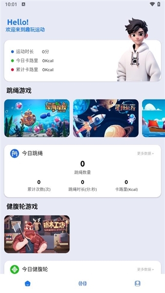 2、首页设有跳绳游戏的入口,同时展示跳绳记录数据,能实时查看跳绳次数、时长及消耗的卡路里信息。