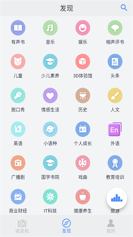 3、要是主页展示的内容不合心意,点击下方的“发现”,就能找到各类不同分类的电台。