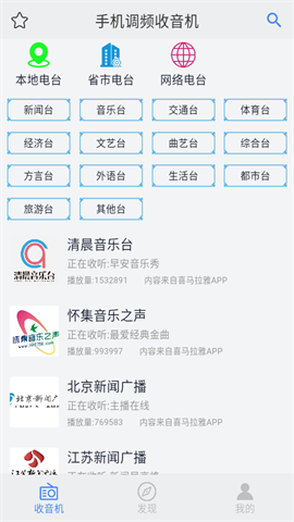 4、收录了上千个国内FM广播电台,配备专线保障7×24小时不间断播放。