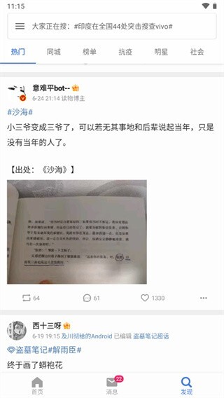 4、在发现页面能够浏览到其他相关类别的微博内容,像“热门”“同城”“榜单”“抗疫”“明星”“社会”之类的都包含在内。
