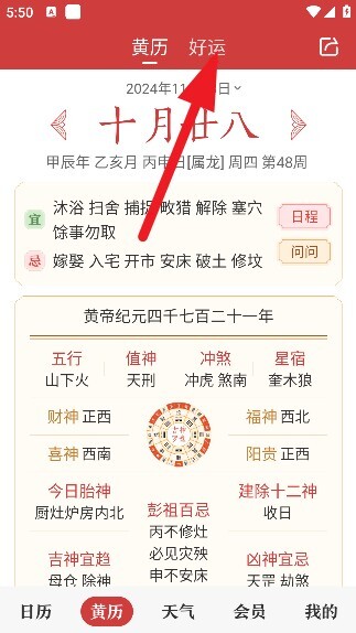 2、进入黄历页面,这里有当天的运势和黄历。