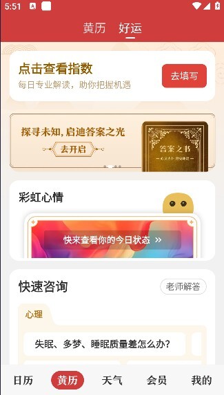 1、能够精准快速的查询黄历,了解进行的相关运势。