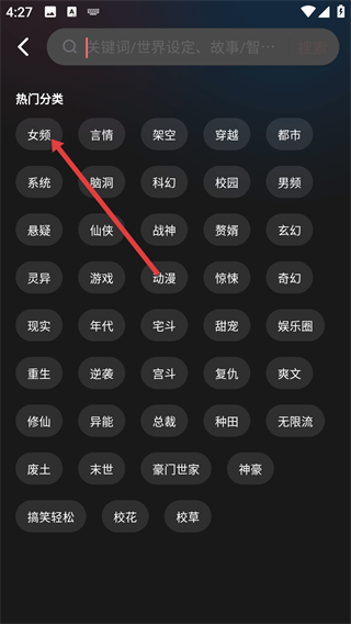2、进入分类页面后,点击【女频】分类标签,可查看女频相关的各类内容。