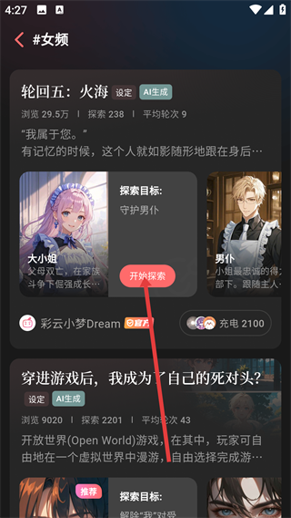 3、在女频内容列表中,找到感兴趣的作品,如【轮回五:火海】,点击【开始探索】按钮,进入作品详情。