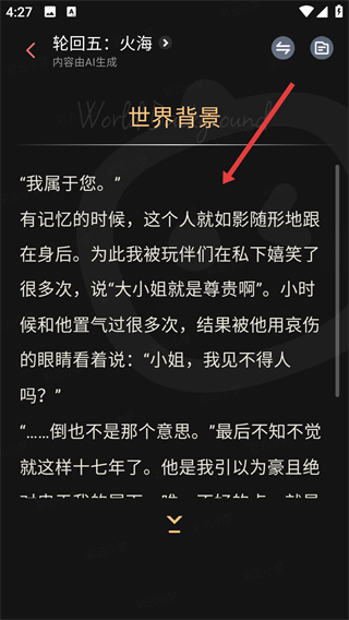 4、进入作品详情后,即可浏览AI生成的内容,如【世界背景】部分的文字,沉浸式阅读作品。