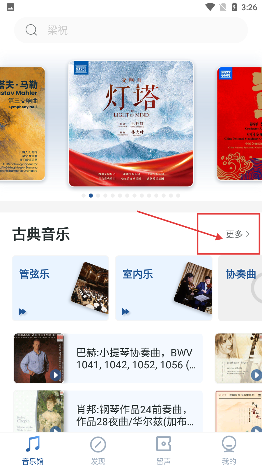 1、打开音乐馆界面,点击【古典音乐】板块的【更多】按钮,即可进入古典音乐分类页面。