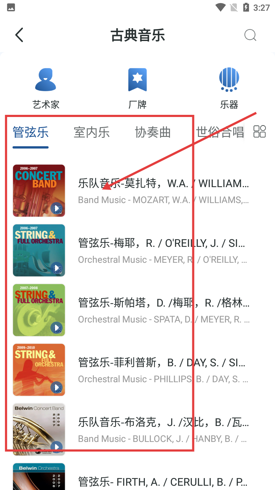 2、在古典音乐分类页面,选择【管弦乐】分类,进入管弦乐专辑列表页面,可浏览乐队音乐、管弦乐等专辑。