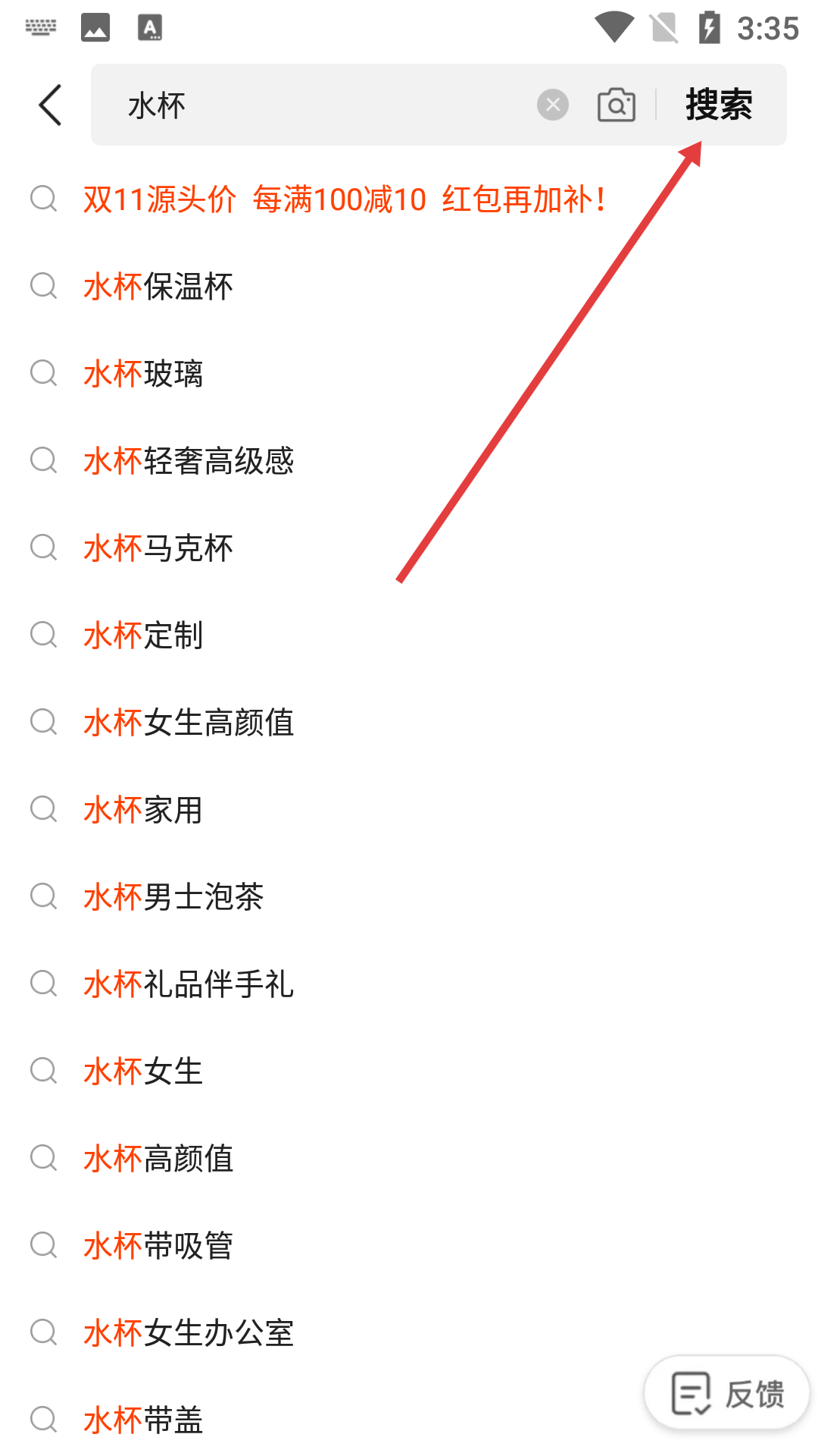 2、在搜索页面的搜索栏中输入要查找的商品名称,如【水杯】,点击【搜索】。