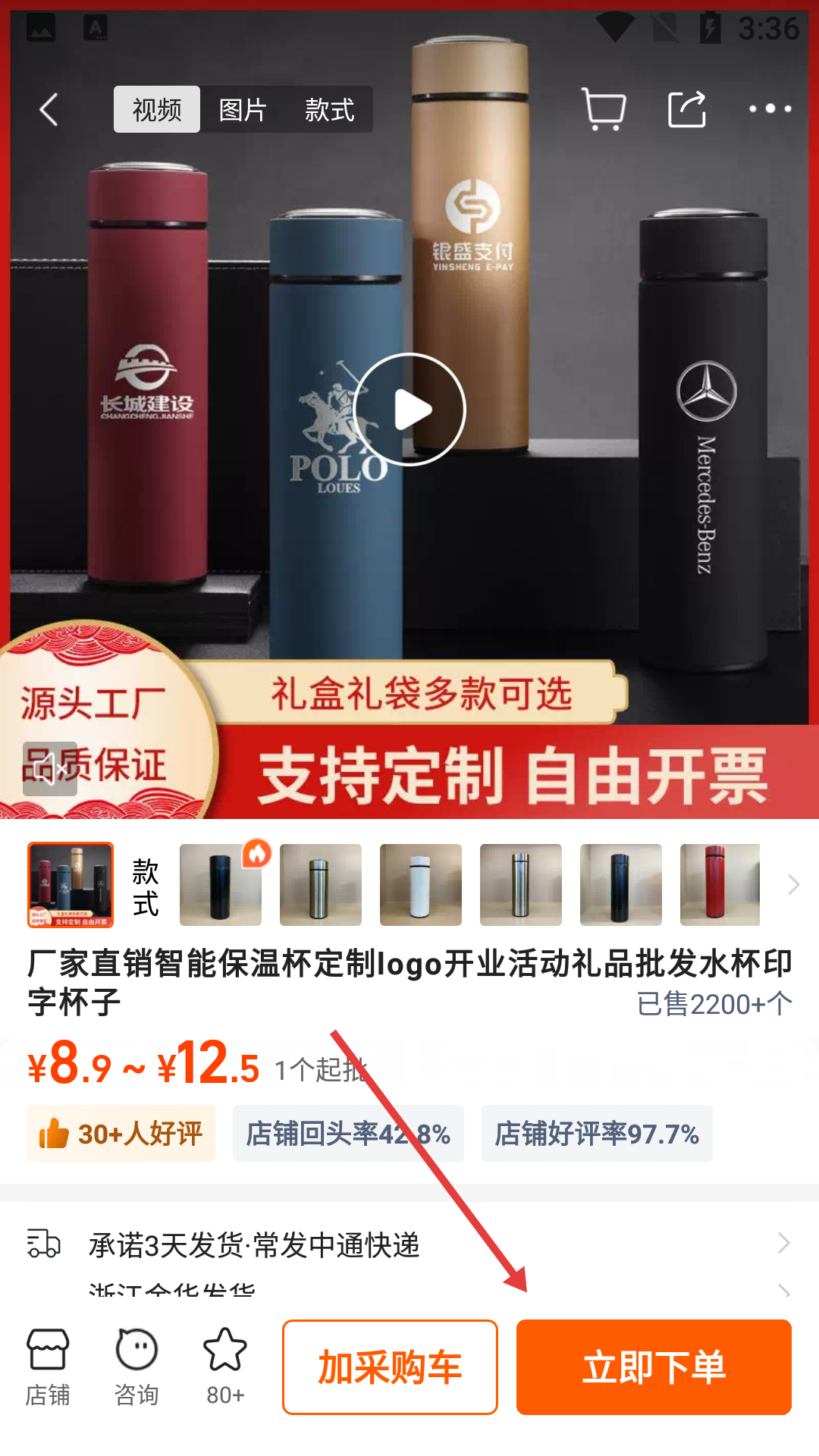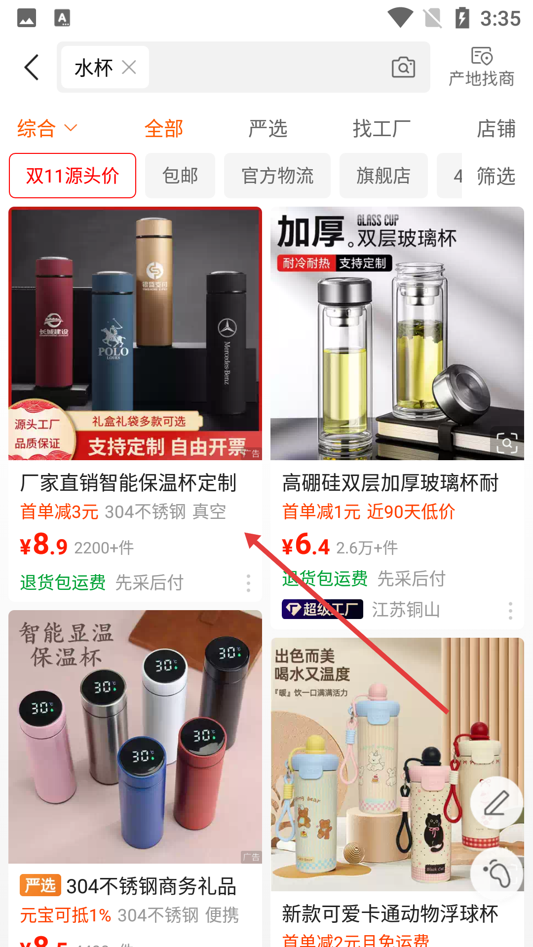 3、在搜索结果中找到目标商品,如【厂家直销智能保温杯定制】。