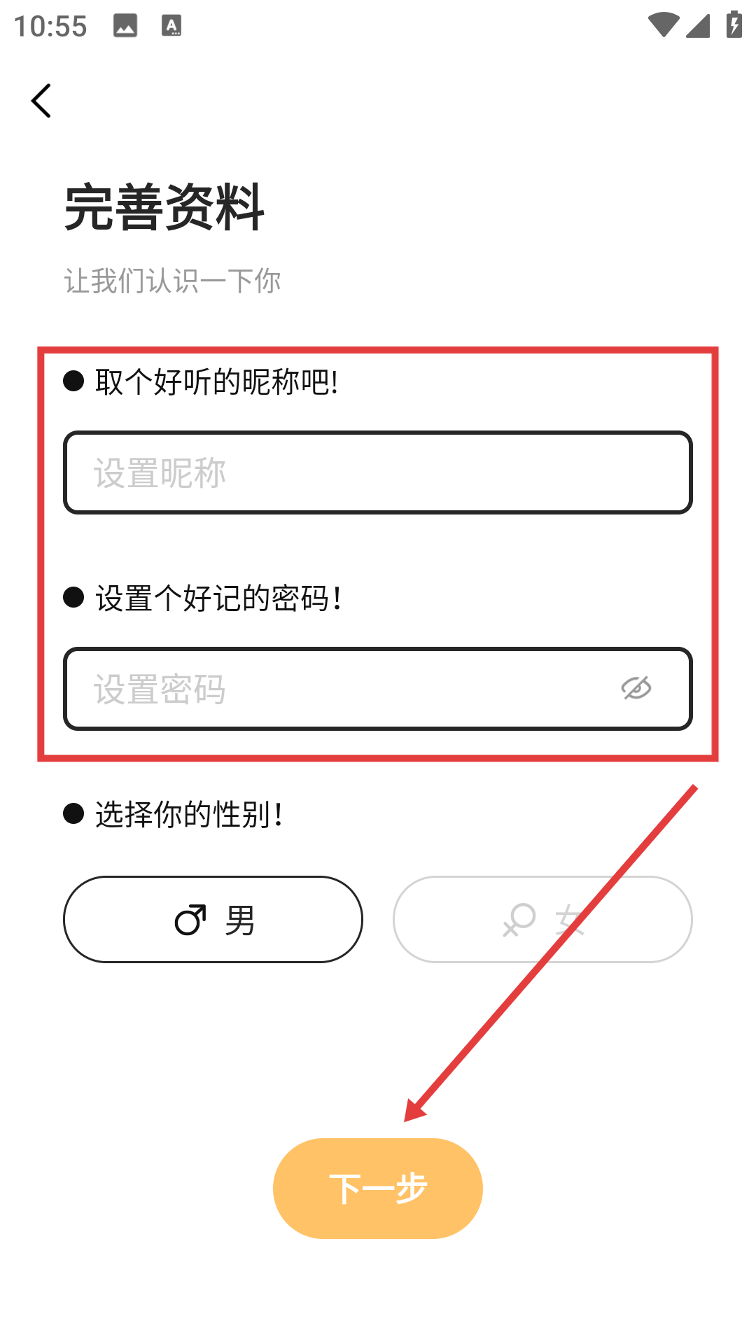 4、在完善资料页面设置昵称和密码,点击【下一步】,完成账号注册流程。
