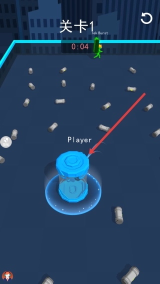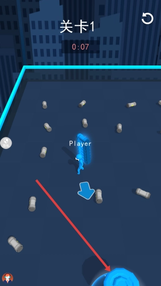 1、进入游戏的第一关,操控蓝色的Player角色,在遍布桶状物体的场景里移动,搜寻关键目标。