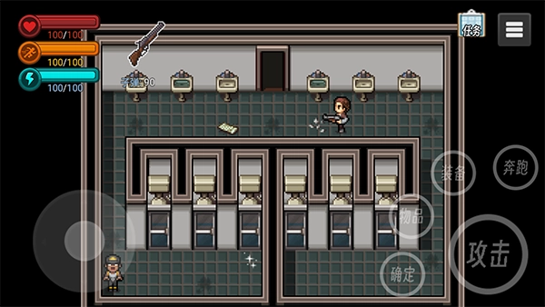 2、左下角是操作轮盘控制角色奔跑和行走的方向,右边则是攻击,以及物品栏装备栏,切换奔跑状态和确认键