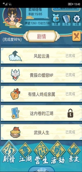 2、朋友。可以在【江湖】板块结识。可以学技能,结婚。