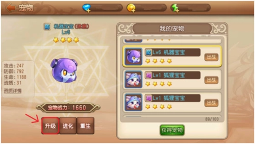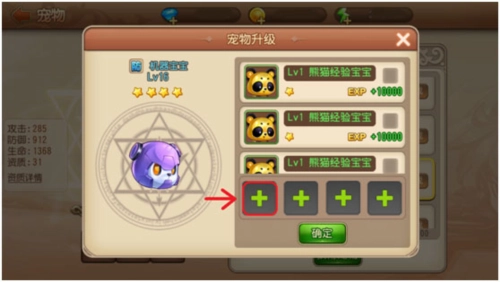 使用专门的经验宝宝升级可以获得大量经验,一只熊猫宝宝提供1W经验,一只小猪宝宝提供2000经验