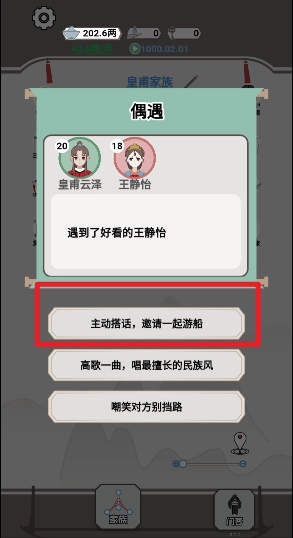 2、偶遇美女,选择“主动搭话,邀请一起游船”。